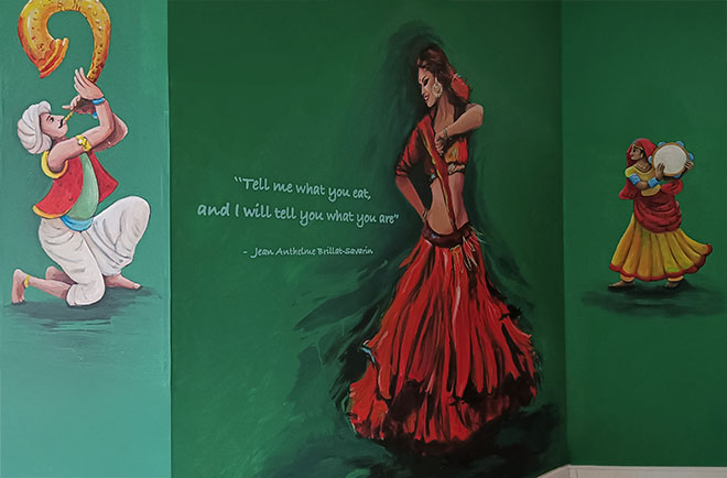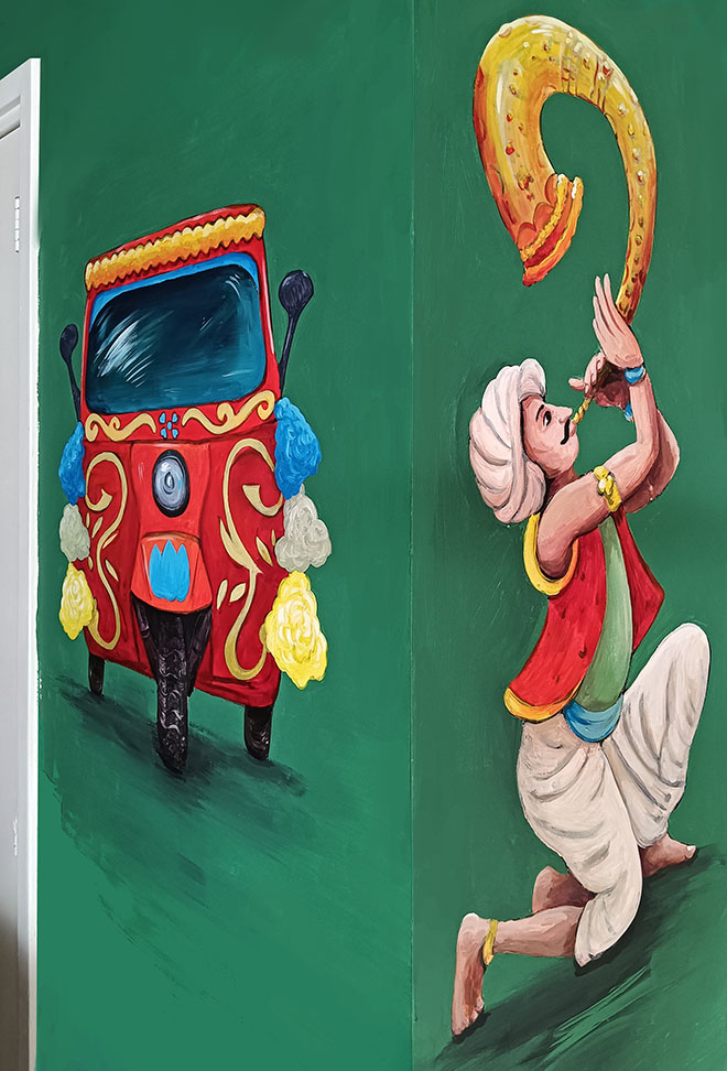Voor het Indiaas restaurant Manju in Eindhoven heb ik een muurschildering gemaakt. Geïnspireerd op de Indiase cultuur heb ik een warme en uitnodigende sfeer gecreëerd die past bij de beleving van het restaurant.